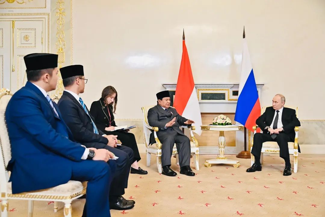 Minister of Defence Sjafrie Sjamsoeddin, accompanied President of the Republic of Indonesia, Prabowo Subianto in a bilateral meeting with President of the Russian Federation, Vladimir Putin, at the Konstantinovsky Palace in St. Petersburg on Thursday (19 June).